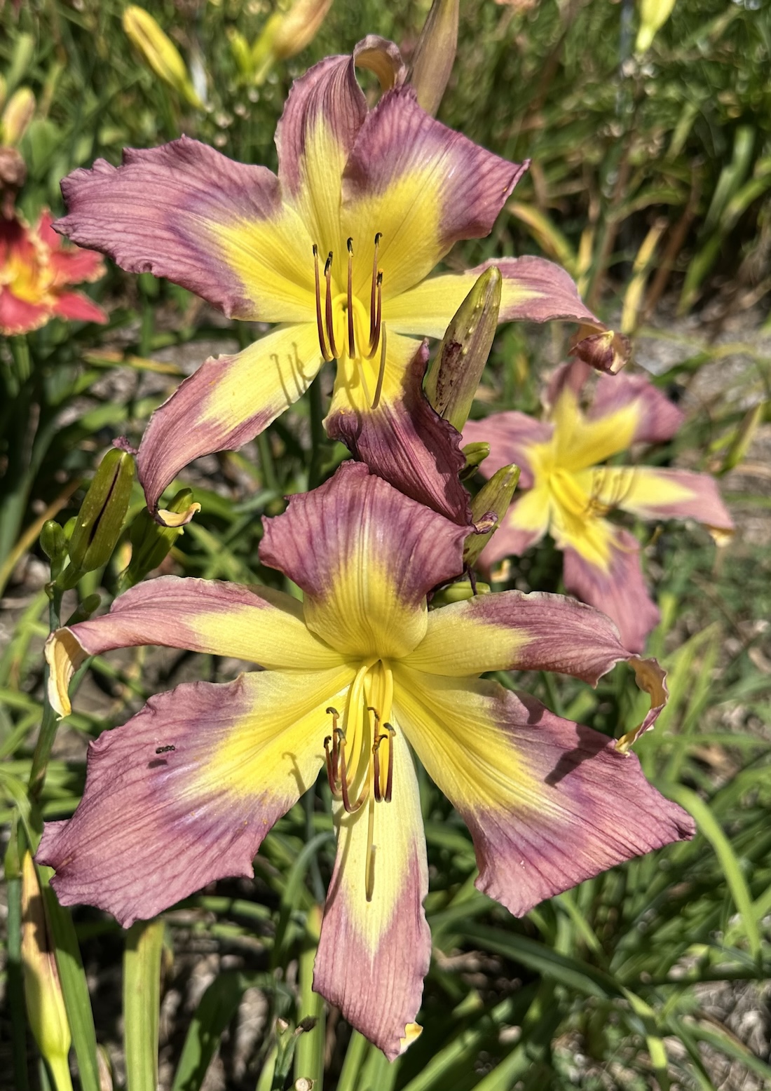Dark magenta large yellow eye and throat purple band twisted crispate sepals. Fun flower to grow and we had fun naming it. Stands tall as the other varieties are finishing.