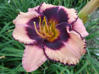 Garden visitor favorite. Great contrast of colors with the light lavender base with the very dark clear grape purple eye. Double edge of purple and white.