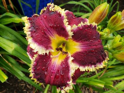 purple plum hazy blue eye, ivory white teeth on petals, green throat