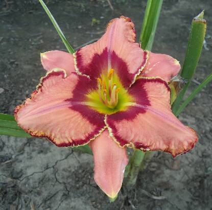 Pink coral w/velvet cranberyy red eye and edge trimmed in ivory yellow green throat