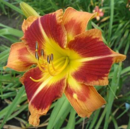 Orange red with a bright red eye and yellow throat. Draws your eye during peak bloom. Cheerful sight at end of season on rebloom. Always puts on a happy face.