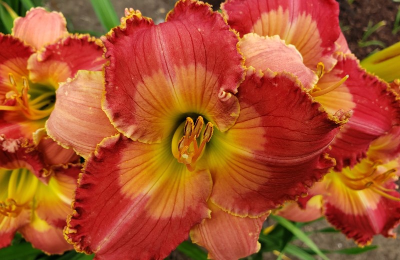 Flaming red & light rose bicolor, light rose watermark, gold edge petals and sepals, green throat.