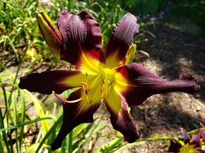 MOUNTAIN STORM starts blooming for us just a little past mid-season and is usually still blooming as the other daylilies are starting to finish up. The dark purple color holds well here in full sun. The oversized bright yellow eye is a wonderful contrast to the dark purple and seems to draw your eye in for a closer look.