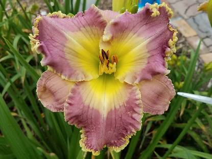 Lavender with cream water mark, bright yellow throat, cream and gold ruffled edge.