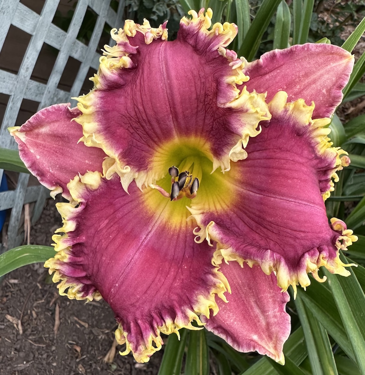 Vivid lavender, elaborate white and gold edge, green throat