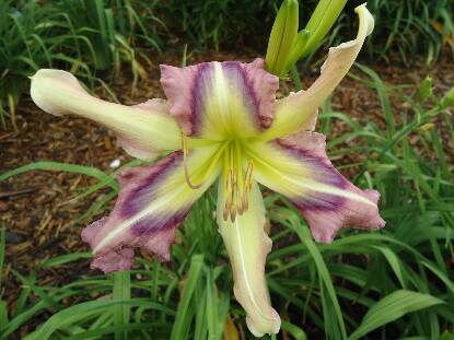 A beautiful bicolor. Lavender with radiating eyezone shades of purple, sepals have a cream w/lavender blush and topped off with a green throat. A quilled crispate.