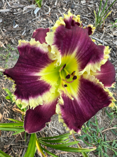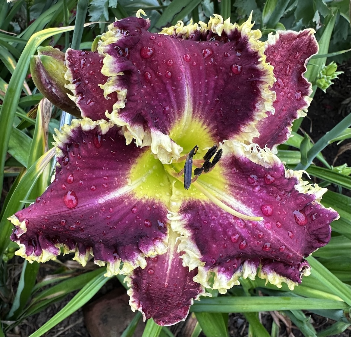 STORMY MORNING is a dark burgundy with shades of purple. It has a gold and white edge with plenty of hooks and horns. Both the petals and sepals have the gold and white toothy edge. The teeth go deep into the bright green throat.